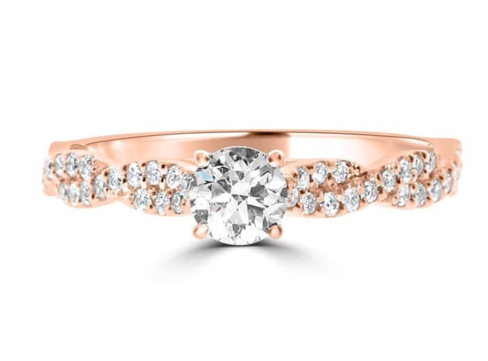 טבעת משובצת יהלומים בצורת קליעה עם יהלום מרכזי בגודל 0.30 קראט ועוד 0.2 נק בצדדים צבע H רמת ניקיון SI1.
